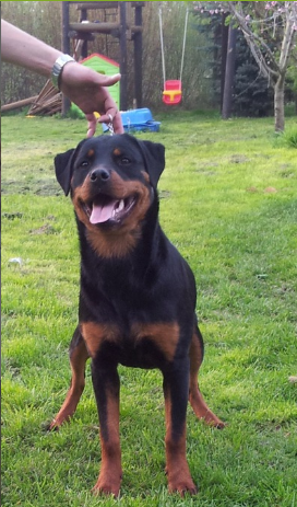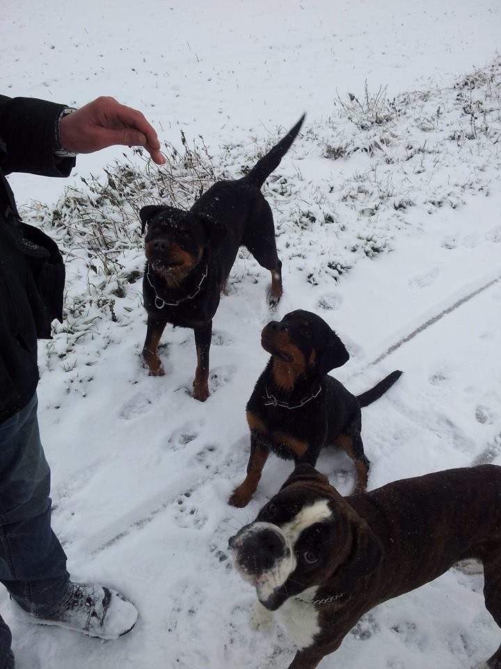Im Sommer 2012 zog auf Wunsch meines damaligen Lebensgefährten die Rottihündin Pepper von der Fischermühle bei mir ein. Die dicke Hummel begeisterte mich. Pepper durchlief die Prüfungen und Zuchtvoraussetzungen mit Bravur. Sie war eine Seele von Hund, lieb, verschmust, treuherzig aber dennoch mit guten Gebrauchshundeeigenschaften ausgestattet. 2013 zog mit Banja von Baccara eine weitere Hündin bei uns ein. Ein Ernergiebündel ohne Gleichen, mit eben so guten Eigenschaften.